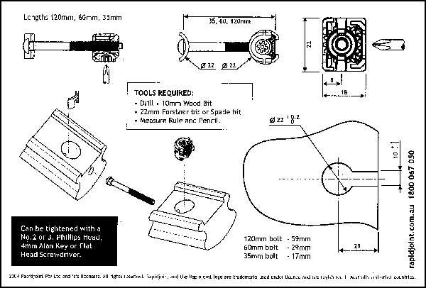 Drilling is simple using a 22mm spade bit for the housing and a 10mm bit for the through, or connecting hole. This can be done in the factory or on site, if the holes are pre-drilled in the factory the joint can be made in a number of seconds! And you won't be fumbling in the bottom of the toolbox for a special tool to tighten or loosen, just grasp your driver drill and the jobs done!